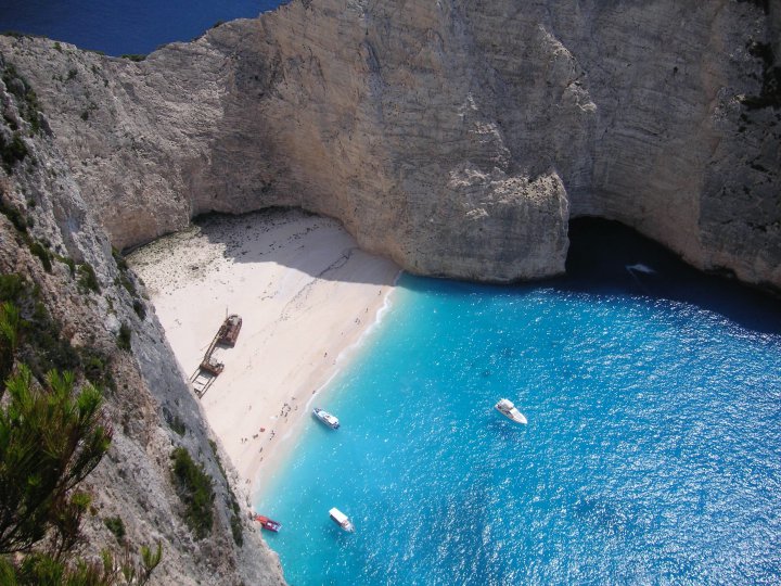 Plage du Naufrage à Zante (île ionienne) où un bateau s'est échoué. Ce navire effectuait la contrebande de cigarettes. Une fois échoué, l'équipage disparut et la cargaison aussi, avant l'arrivée des autorités locales.