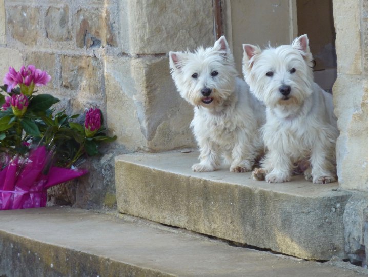 Vus à Oban en Écosse (leur région d'origine), deux petits Westies aux yeux vifs et curieux.