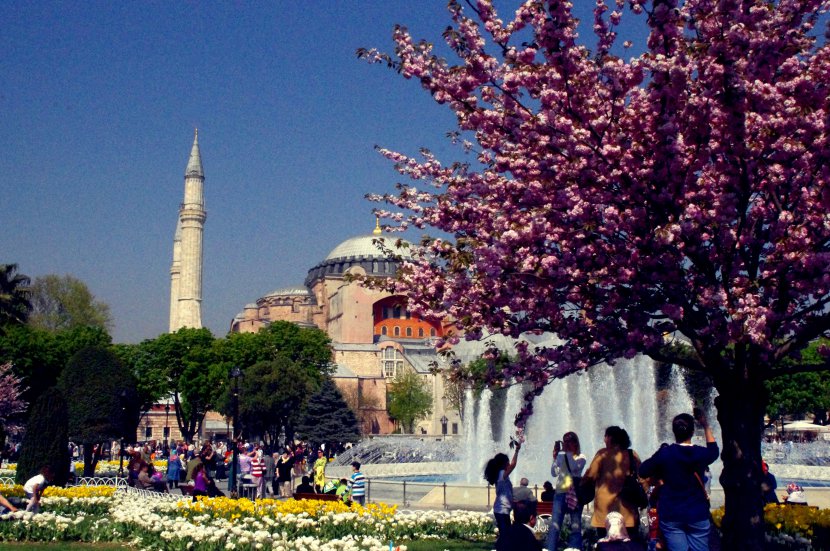 Un cerisier en fleur à Istanbul en face de la mosquée Sainte Sophie
