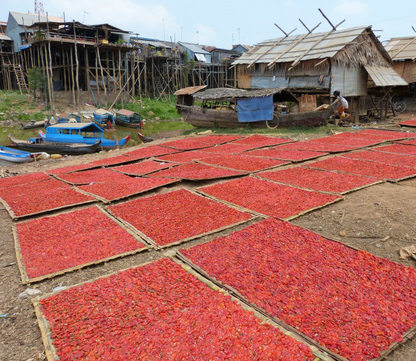 Cambodge. Nous sommes à Kampong Chnang où nous traversons un "champ de planches" de poivrons rouges séchant au soleil.