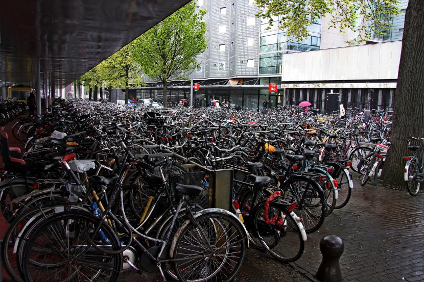 Partie infime (et j'insiste sur infime) du nombre de vélos dans les immenses parkings ad-hoc près de la gare centrale d'Amsterdam. Je pense que c'est unique au monde. Pas pour rien que c'est le pays de la petite Reine avec un réseau "spécial bicyclette "exemplaire"...