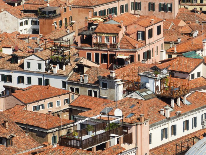 Belle prise de vue sur ces toits et petites terrasses en bois qui sont des altana. A l'origine, les vénitiennes se doraient les cheveux au soleil, pour obtenir le fameux blond vénitien.