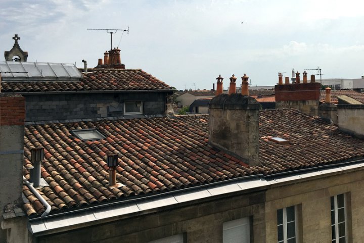 Photo un peu trop sombre à mon goût. Mais les tuiles et le ciel (ni gris ni bleu)sont bien bordelais. J'ai habité cette ville et cette vue ressemble bien à ce que je voyais de ma fenêtre.