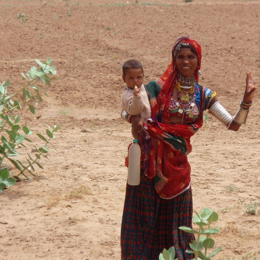 Femme du Rajasthan dans le désert du Thar. Comme beaucoup, leur quotidien, c'est d'aller puiser de l'eau. Lors de cette brève rencontre, elle était contente d'avoir pu trouver une simple bouteille d'eau pouvant lui servir de contenant.