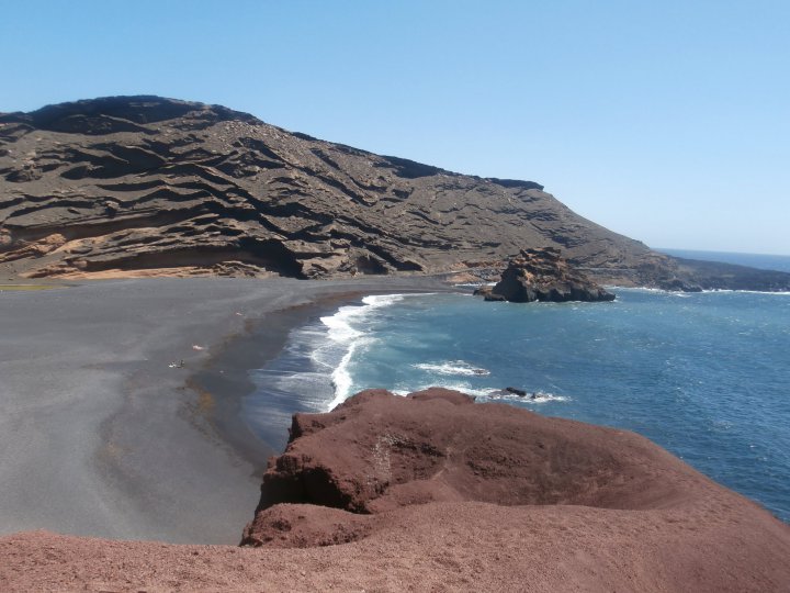 La plage de El Golfo sur l'île de Lanzarote, dans l'archipel des Canaries (*voyage en 2015). Une vaste plage de sable noir dans un décor très minéral sur cette île volcanique.