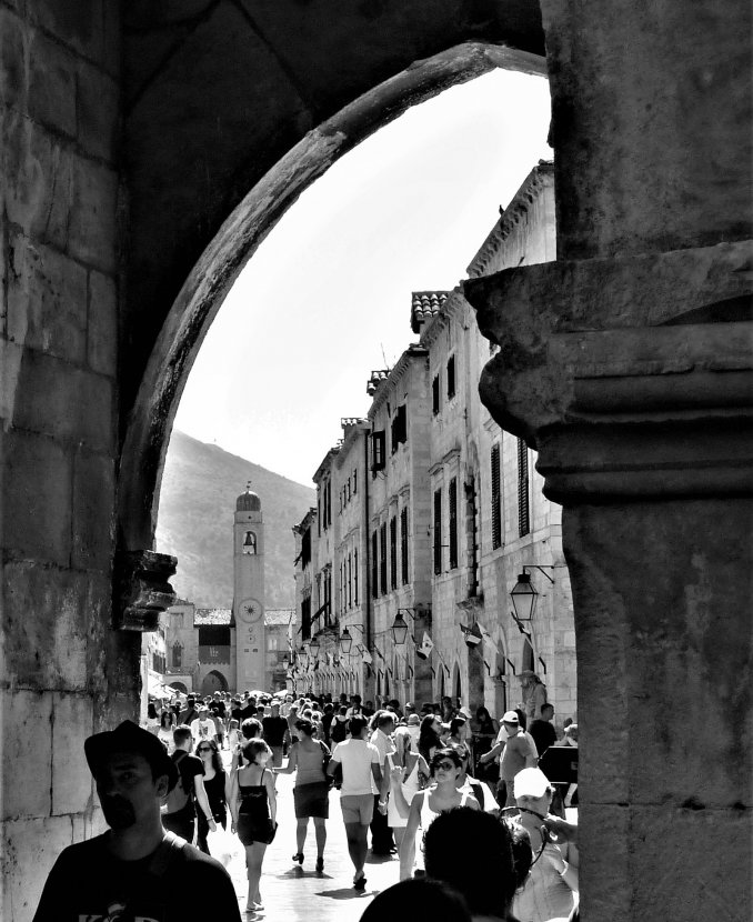 Encadrement du Stradun, principale artère de la cité médiévale de Dubrovnik. Construite au XII ème siècle, cette belle rue pavée se termine par l’élégante tour de l'horloge haute de 35 mètres. Ce clocher date de 1444. Mais a été entièrement Reconstruit en 1928, La monumentale cloche, qui pèse plus de 2 000 kilos, est la seule partie d'origine de la tour. Et pour faire le lien avec le thème précédent je dirais et bien oui à Dubrovnik aussi il y a foule.