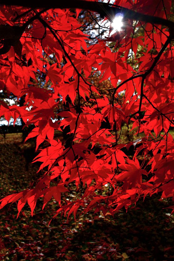 Près de Paris, le soleil joue à cache-cache entre les feuilles de cet érable pourpre, laissant l'ombre de ses feuilles en transparence. Ce sont des couleurs naturelles : cf photo en plan élargi sur le forum.