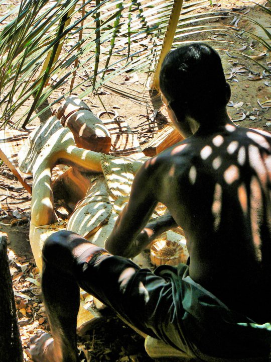 Sri Lanka. Photo furtive d'un sculpteur sur bois à l'ombre de branchages entrelacés qui par le jeu de l'ombre et de la lumière dessinent sur son dos une impression de tatouage.
