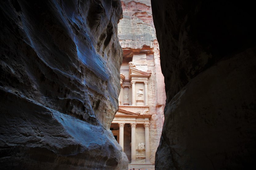 Dans l'ombre de la sortie du défilé de la gorge du Sîq, traversant le massif du Khubtha, on apperçoit la Khazneh, le fameux temple emblématique de Petra. Dans la pénombre l'age de pierre et la lumière du matin sur la paroi royale. Souvenir de 2012.