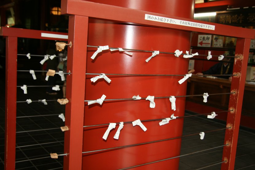 An Japon, les omikuji sont des divinations écrites sur des bandes de papier que l'on tire au sort dans les sanctuaires ou les temples. Ces prédictions sont pliées et attachées sur des tiges pour conjurer le mauvais sort.