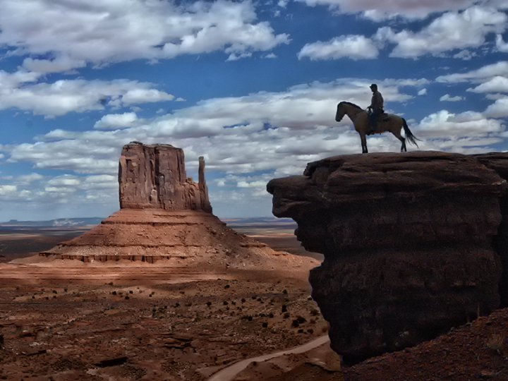 @Paul: en pratique un Navajo se tient dans les parages du"visitors center"avec,en général un cheval pie(robe multicolore très appréciée par les amerindiens),a la demande de l'un ou l'autre visiteurs($$$$ svp.)il se positionne volontiers sur le piton rocheux(cfr.ton excellente photo)...une aubaine pour les autres visiteurs qui mitraillent a leur tour pour une photo "volée" en somme.