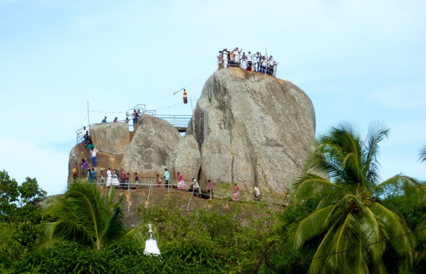 Sri Lanka 2016. Rocher de Mihintale près de la ville d'Anuradhapura au centre nord du Sri-Lanka, du haut de ce rocher perché magnifique vue sur la forêt très verte, sur le temple et le grand Bouddha blanc.