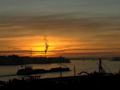 Finalement, j'arrive sur le port d'Amsterdam et j'assiste au lever du soleil sur quelques bateaux cargos et autres cheminées fumantes. L'endroit n'est pas exactement joli mais le soleil orangé, le calme du petit matin et l'espèce d'état anesthésique dont je ne suis pas encore sorti donnent au moment un côté surnaturel.